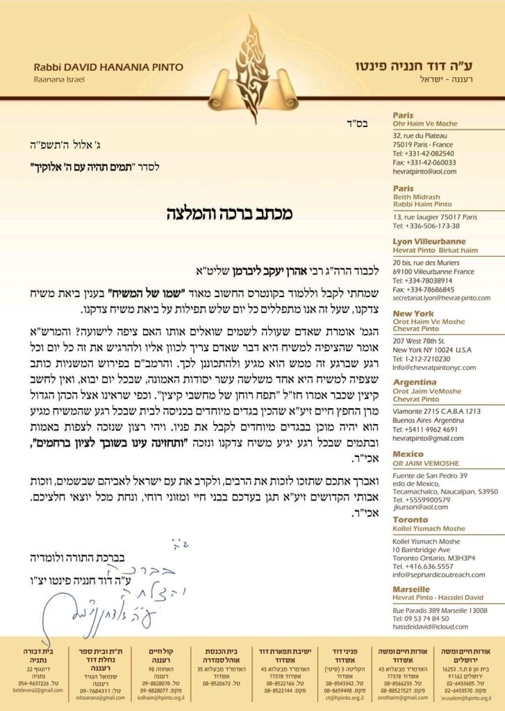 Michtav Bracha from HaRav Dovid Chanania Pinto Shlit’a